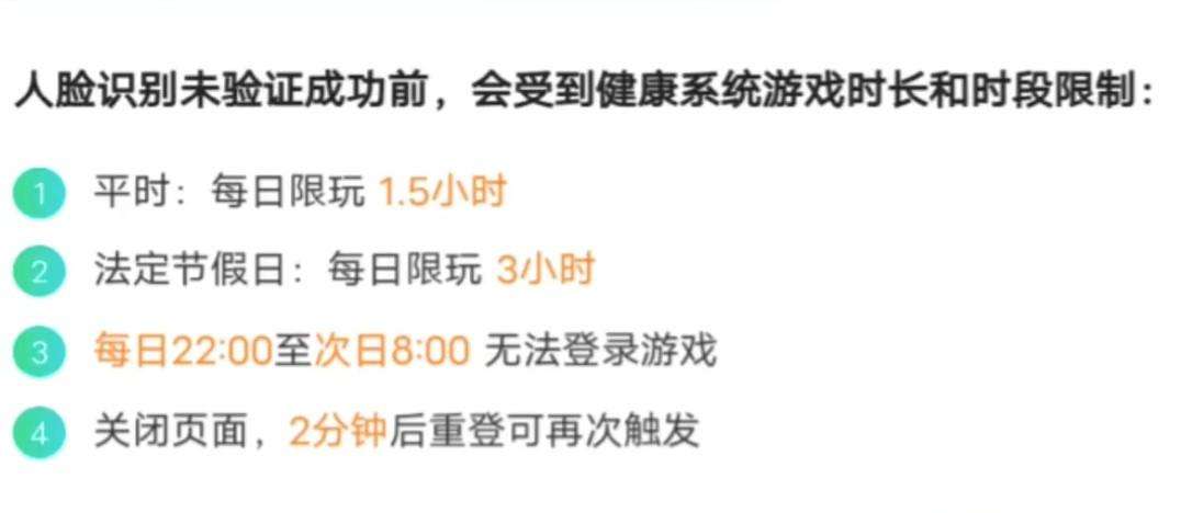 若玩家暫不驗證人臉,則會出現防沉迷限制條例。平時每日可玩1.5小時,法定節假日期間每天可玩3小時,每日22點至次日8點期間均無法登錄游戲。