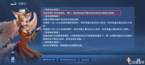二、未成年人健康系統禁賽。 未成年用戶僅能在周五、周六、周日和法定節假日的20點至21點進行游戲。