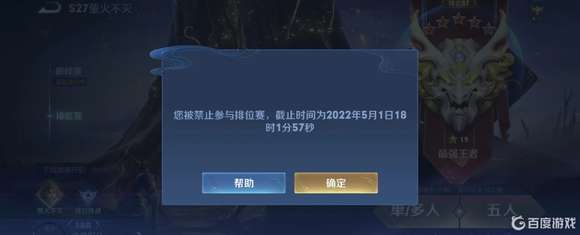六、因為辱罵、發言、送人頭等原因被禁賽的,則通常是七天至三十天的處罰,可以點擊排位賽來查看,會顯示具體的截止時間。