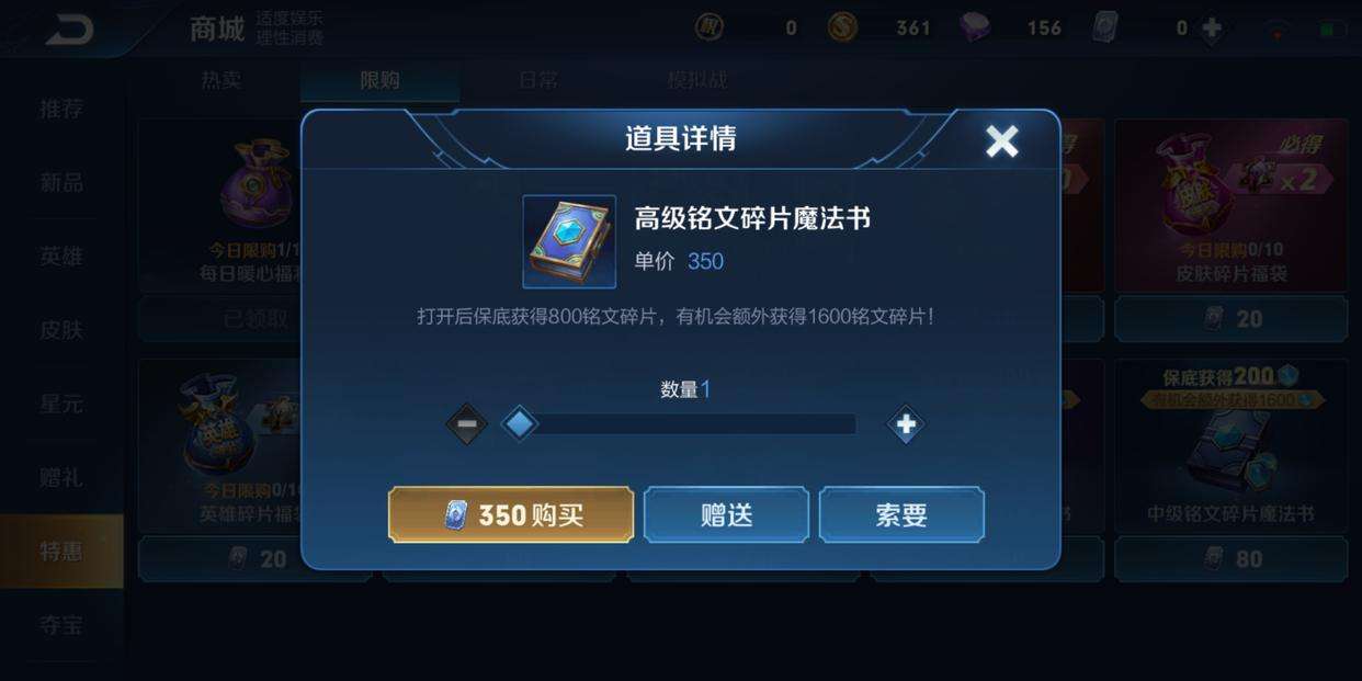 在商城中的特惠界面里的限購中,我們可以可以購買銘文碎片魔法書,一共有三種魔法書,分別為特級、高級和中級。