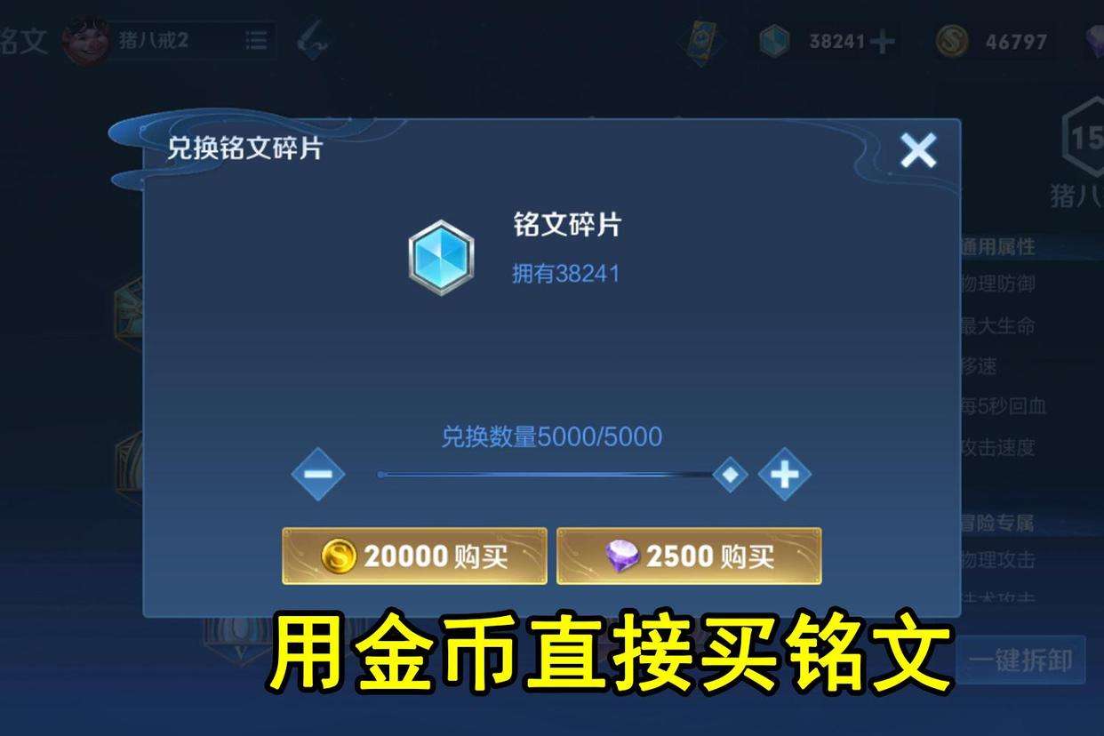 如果說現在還沒有太多的銘文碎片,那么完全可以直接用金幣或者算是來購買,新版本的銘文碎片都不用抽獎了,直接可以兌換,如果說你新建了個號,那么第一時間就應該把銘文配好,而不是去花金幣買英雄,因為銘文在前期很重要,一套滿級銘文帶來的收益不亞于一件神裝。