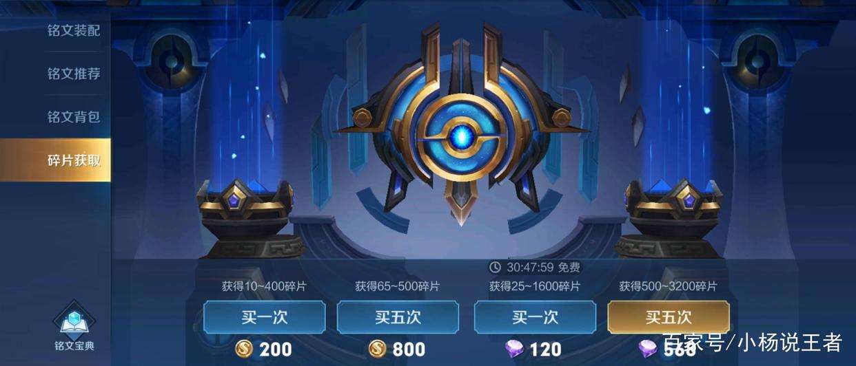 每個玩家最初都可以獲得所有的一級銘文,而將這些一級銘文升級到五級銘文是需要銘文碎片的,銘文碎片的獲得方法一般是靠鉆石抽獎獲得(因其他活動獲得的銘文碎片太少,與鉆石獲得的銘文碎片的數量無法相比故忽略不計),而銘文碎片的抽獎又太過坑人,大概為568鉆石平均下來可以獲得800銘文碎片,上面顯示最多可以獲得3200銘文碎片,可是小楊似乎最多才得到過1600銘文碎片左右。很多情況都只是500銘文碎片!