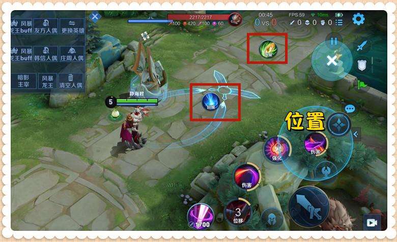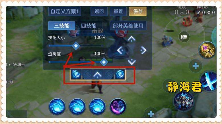 最后,我們用自定義布局設置還可以完成一些騷操作,就比如我們可以將回城、回復的按鈕調整到特定的地方,如上圖,我是想將回城放到雌雄雙劍-近的交匯點,想將回復放到雌雄雙劍-遠的交匯點,對于一個新手來說,這么設置后,確實可以提升雙劍的命中率。