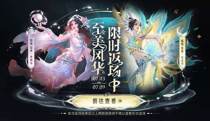 7月3日-7月9日,至美系列兩款皮膚迎來最后一次直售形式返場。其中,西施-至美·乘鯉謠返場價格為888點券,甄姬-至美·化雀舞返場價格為1788點券。