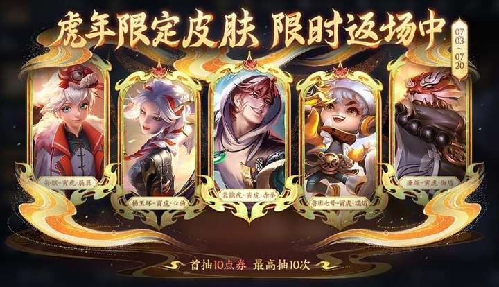 裴擒虎-寅虎·赤拳、魯班七號-寅虎·瑞焰、楊玉環-寅虎·心曲、廉頗-寅虎·御盾、孫臏-寅虎·展翼等5款虎年限定皮膚將以祈愿抽獎的形式返場,10點券一個虎神幣,每次抽獎需要消耗6個虎神幣,也可以通過積分兌換的方式獲取。