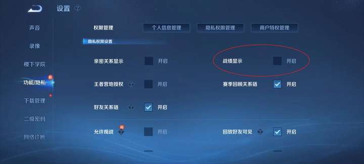 找到【戰(zhàn)績顯示】功能(默認開啟),點擊旁邊的開關(guān)將其關(guān)閉