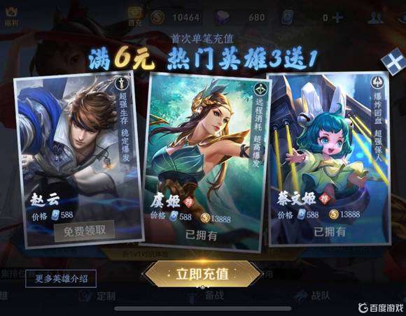 英雄趙云無法免費(fèi)獲得,關(guān)于王者英雄趙云的獲得途徑有三種方式,但都離不開對王者游戲的充值。第一種如果你在王者游戲中還未充值過,那么首頁會有首充選項(xiàng),首充滿6元,贈送熱門英雄3選1.其中就有趙云。