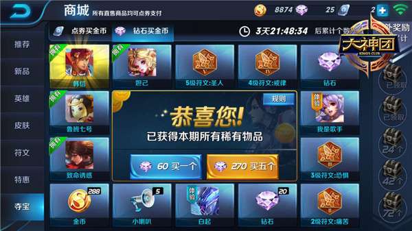 在《王者榮耀》中,玩家可以通過使用點券和鉆石參加奪寶來獲取英雄——武則天、韓信。在游戲中武則天屬于法師型英雄、韓信屬于刺客型英雄,武則天的法術傷害非常高,且大招可以全屏攻擊敵人。韓信的物理傷害不俗,但比較考驗操作。這兩個英雄也是只能通過奪寶方式獲得,奪寶抽取時幸運值達到滿值后必定能獲得。