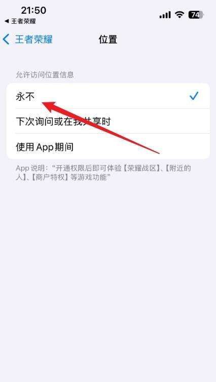 最后,在 “位置” 頁面中,勾選 “永不”。這樣一來,游戲就無法獲取你的位置信息,綜合聊天旁邊的地區也就不會再顯示相關聊天內容了。