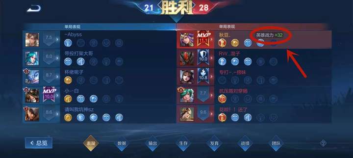 打完對局,點擊右下角數據,然后就會出現下面7個數據,一般都會默認出現第二個英雄數據,自己選擇左邊第一個表現,箭頭圈圈處就是排位表現分戰力加成,點進去就能看到自己目前的戰力。