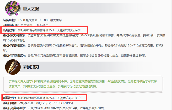 新賽季如果繼續出狩獵寬刃和以狩獵寬刃合成的打野刀的話,野區保護機制還有。但是出棄鱗短刃和以棄鱗短刃合成的打野刀則可以無視野區保護,作為平衡出棄鱗短刃和以棄鱗短刃合成的打野刀的英雄, 前4分鐘對兵線傷害降低25%,清線能力降低。