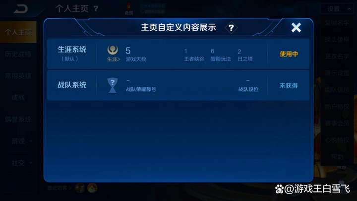 按照以上方法操作,那么其他玩家就再也看不到我們的游戲天數(shù)了。若是有玩家嫌麻煩,我們其實還可以通過將展示設置的生涯系統(tǒng)信息替換成戰(zhàn)隊系統(tǒng)信息或者大賽信息即可,這樣同樣可以避免其他玩家查看到我們的游戲天數(shù),具體方法如下: