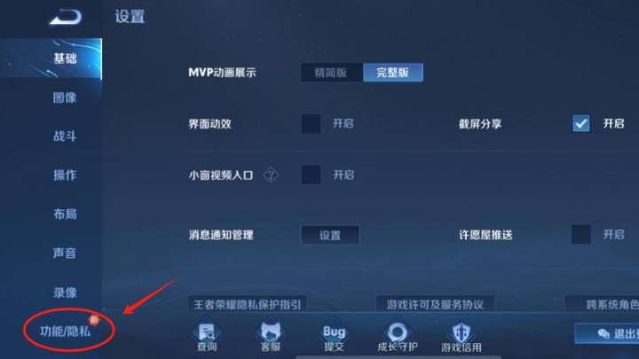 點擊“功能/隱私”