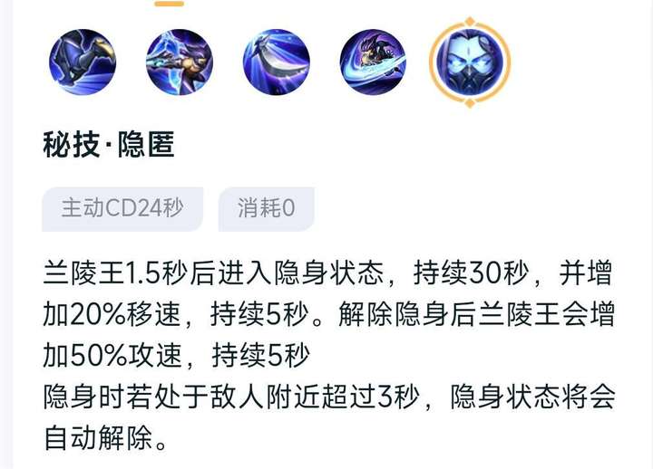 2.如果是打野蘭陵王可以出門就開隱身【四技能:秘技·隱匿】,因為破隱可以加攻速,加快打野速度。 3.【二技能:秘技·影蝕】可以被凈化掉;二技能自帶斬殺效果,對面殘血時可以隱身徘徊,嘗試丟一個二技能過去就走,命中足以炸死。