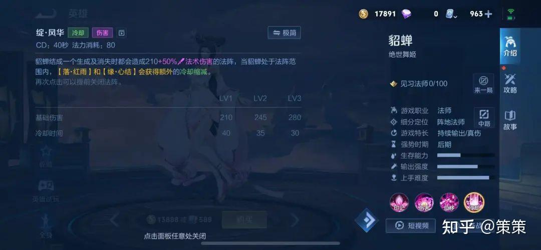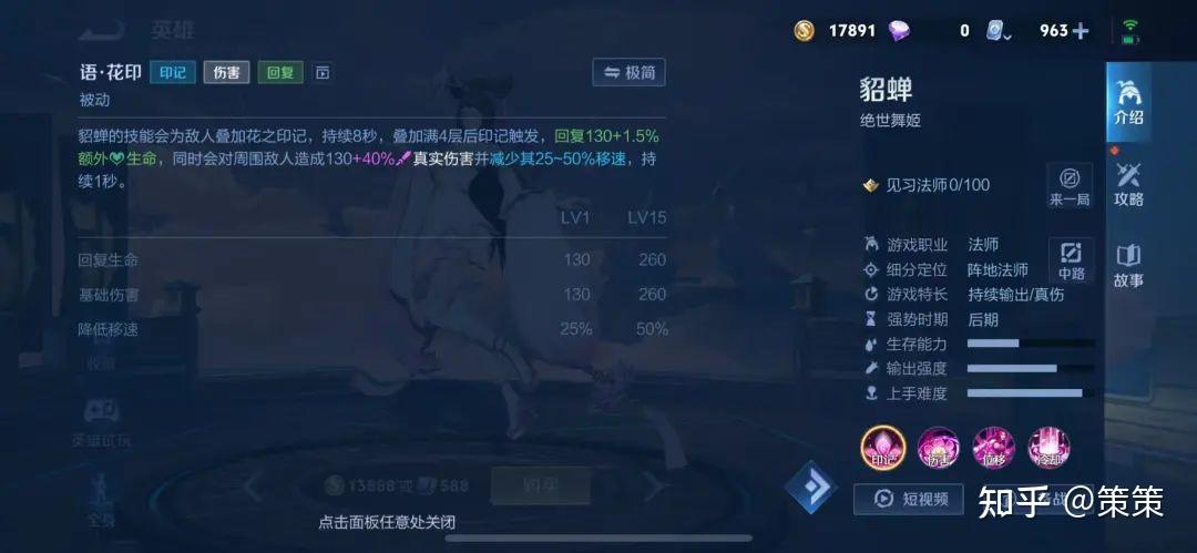 貂蟬依賴二技能、被動作為法刺打出高額的傷害,大招也是為了給予我們能夠更多打出爆炸傷害的空間。不斷二技能的過程中是免疫的真空時段,優秀的貂蟬不斷利用這一點躲避對方傷害和技能。