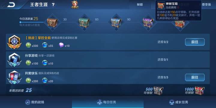 每天把所有的任務寶箱給領完了,可以獲得50的銘文碎片,當完成任務后達到了每周的任務活躍度寶箱時,我們一共可以領取2個箱子,也就是300的銘文碎片,每周都一共可以獲得650的銘文。
