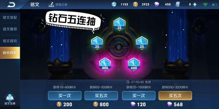鉆石抽獎能在短暫的時間里獲得十分多的銘文碎片,也是唯一一個免費方式最快獲得銘文碎片的辦法,而且鉆石也是十分容易獲得。