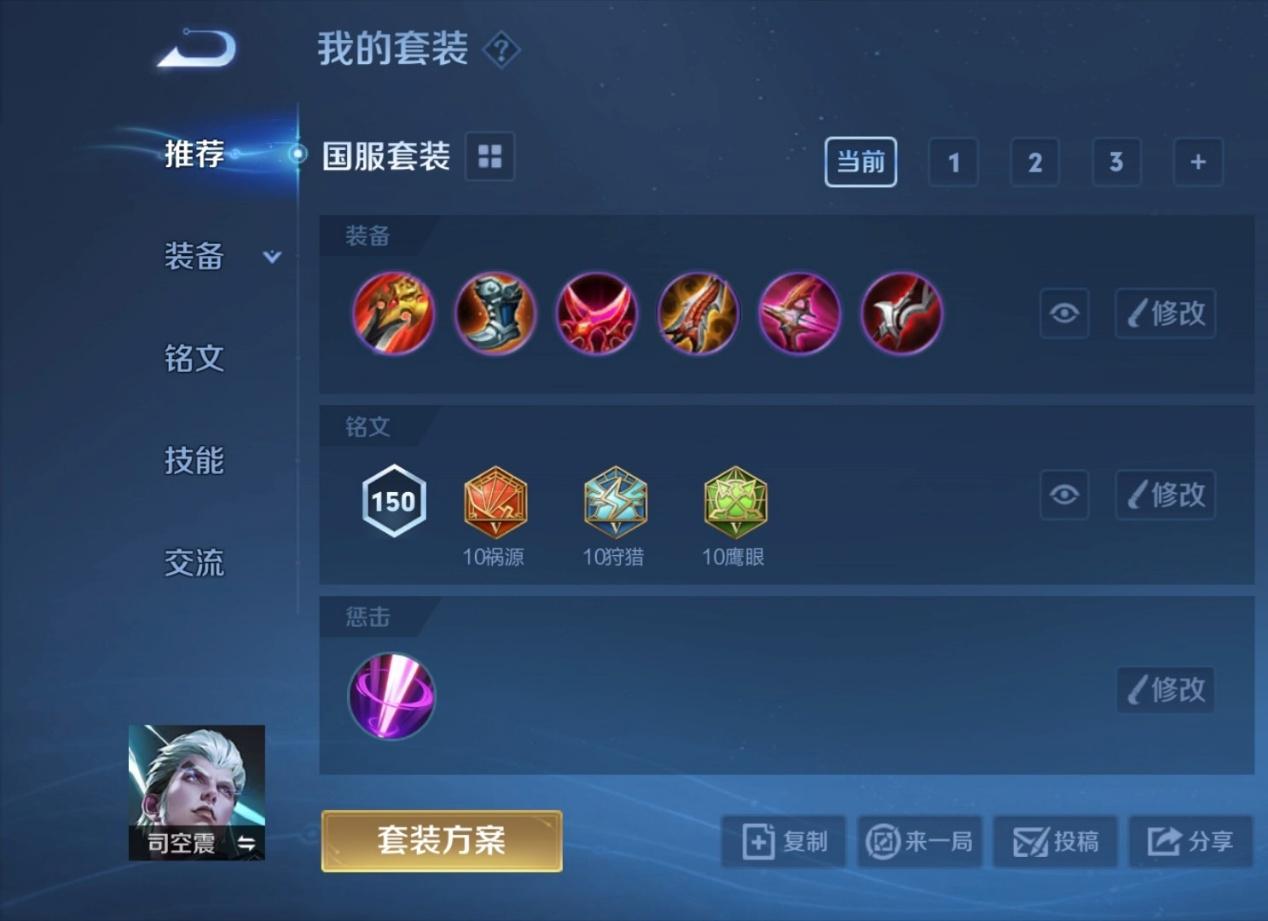 出裝銘文在這個模式里是最重要的,我們直接選擇全輸出裝備,可以帶個懲擊去打野加速發育。因為司空震在這個模式里同樣很吃經濟,需要快速發育拿到裝備和積累天賦加點,中期開始才能發力。