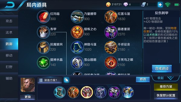 1、出裝搭配:抵抗之靴 + 紅蓮斗篷 + 不死鳥之眼 + 極寒風暴 + 反傷刺甲 + 暗影戰斧