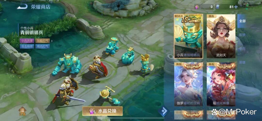 在11月27日之前,可以用1顆榮耀水晶兌換小兵的新皮膚,名字叫作“青銅鏘鏘兵”。
