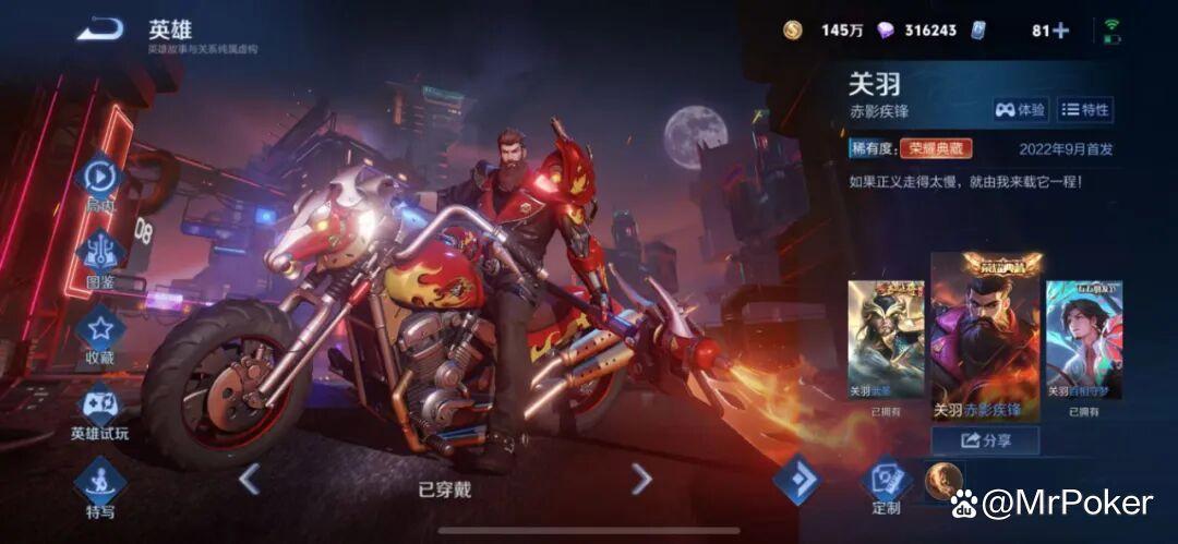 關羽這款榮耀典藏當初上線的時候被玩家噴的不輕,很多玩家認為關羽騎摩托實在是太過奇葩,不符合角色的設定。