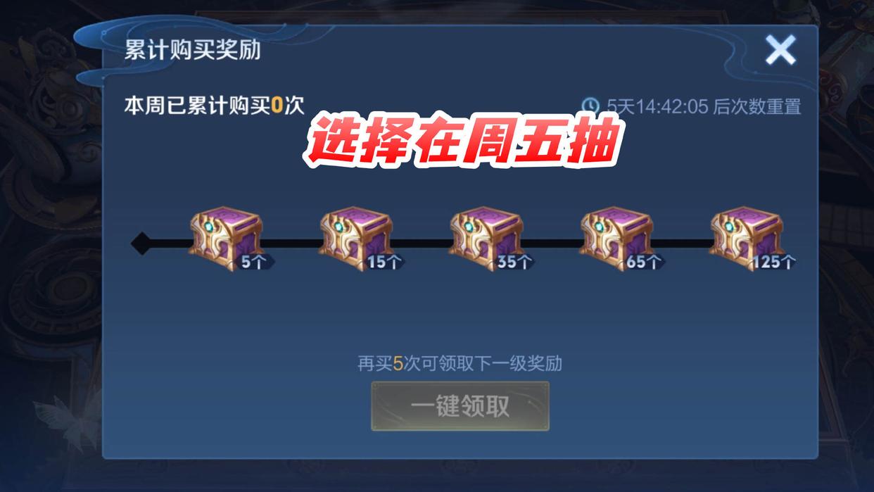 第二個(gè)小技巧,就是抽獎(jiǎng)時(shí)間方面了。我們打開榮耀水晶抽獎(jiǎng)的獎(jiǎng)池我們可以看到,他旁邊有一個(gè)累計(jì)購買的獎(jiǎng)勵(lì),每周如果進(jìn)行5抽,就會(huì)有一個(gè)額外的奪寶券。