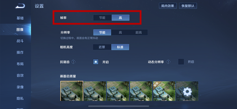 這部分的設置取決于你的手機性能的高低,手機越好,畫質開到最高也沒關系。但是無論你用的是什么手機,幀率一定要選擇高,這是保證游戲畫面順暢程度的設置,對游戲體驗影響很大。