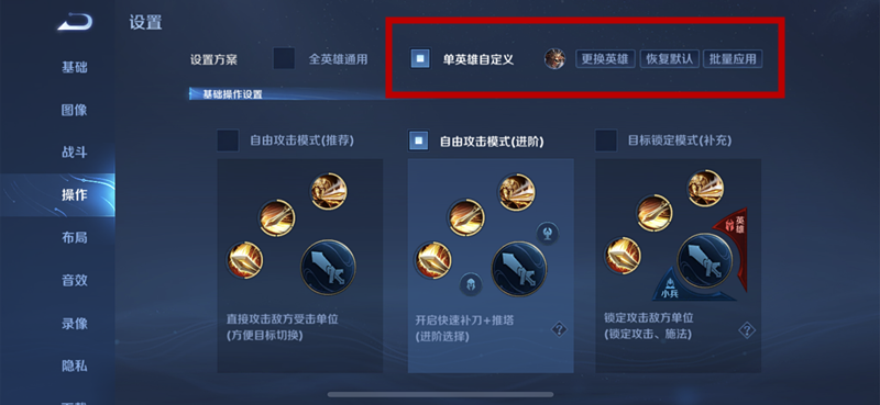 這個部分設計項非常多,而且對操作非常重要。首先是點開“操作”后最上面,設置方案支持單英雄自定義,也就是說你玩每個英雄的操作界面都可以專屬定制,建議根據自己常玩的英雄進行針對性設置。下面就要講的是不同英雄該怎么調整操作界面。